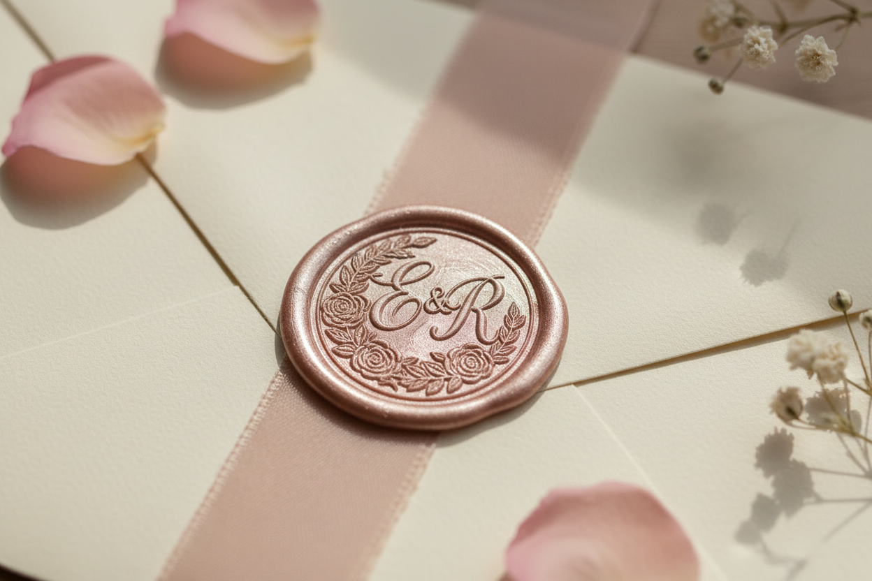 - Thoughtful Embellishments: Details transform an invitation into a wedding keepsake. Common enhancements include:- Wax seals in custom colors or with a personalised monogram.- Silk or velvet ribbons to bundle inserts together.- Envelope liners with a complementary pattern or color that provides a "wow" factor upon opening.